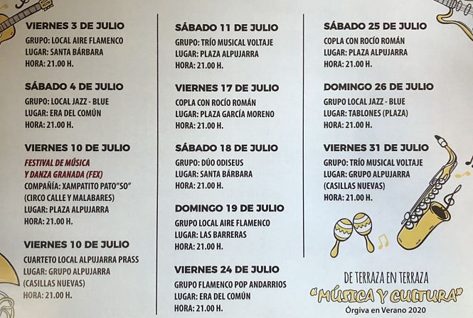 El Ayuntamiento de Órgiva ha organizado para todo este mes de julio una serie de actos enmarcados en el programa festivo “De Terraza en Terraza”. En total serán una docena de actuaciones que se llevarán a cabo durante los fines de semana repartidos en numerosos rincones del municipio.