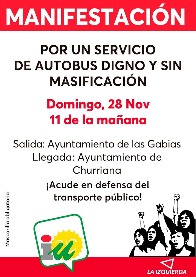 IU Churriana ha organizado una movilización para el domingo 28 de noviembre a partir de las 11 horas, que saldrá desde el Ayuntamiento de Las Gabias hasta llegar al Ayuntamiento de Churriana, para conseguir que el Consorcio Metropolitano ponga solución a los problemas de la línea de 156.