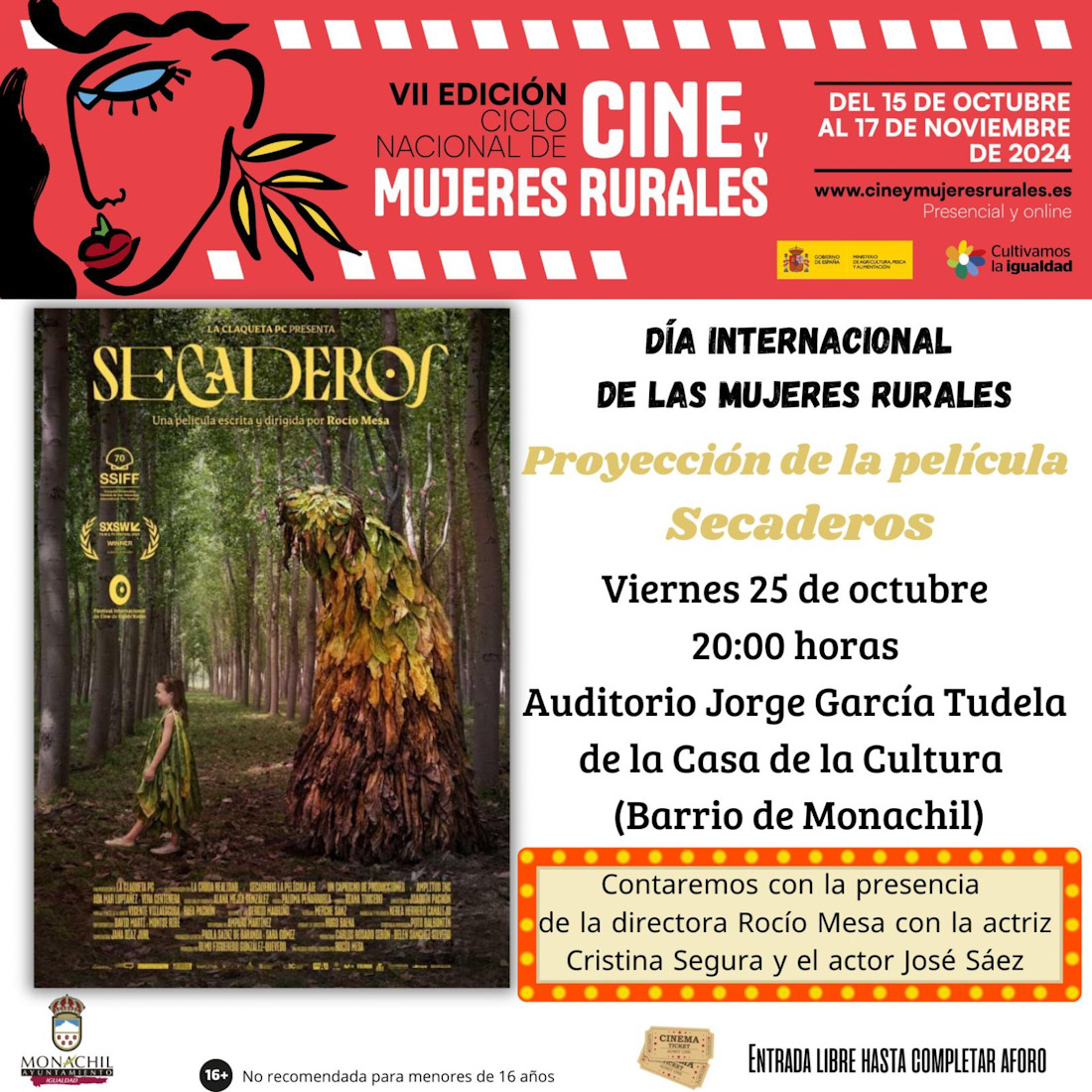 El auditorio Jorge García Tudela de la Casa de la Cultura de Monachil acogerá este viernes, 25 de octubre, a las 20 horas la proyección de la película ‘Secaderos’, con motivo del Día Internacional de las Mujeres Rurales.