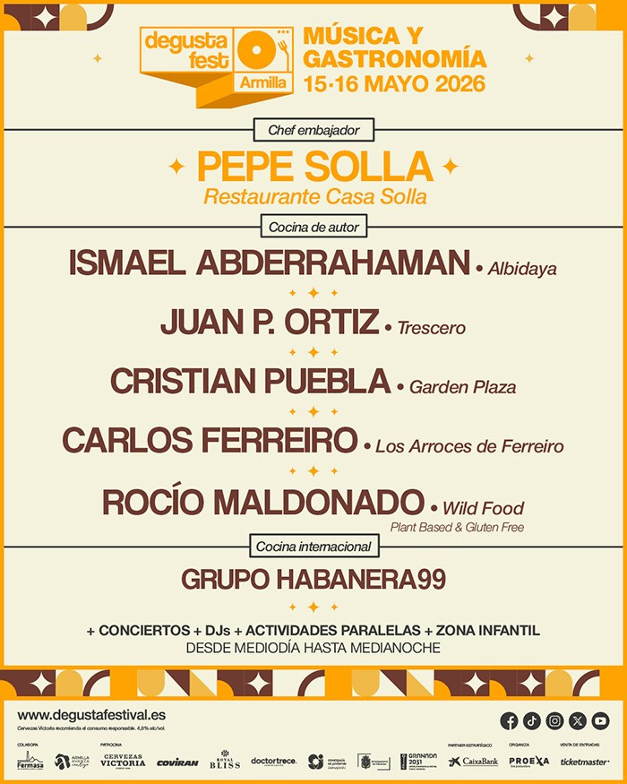 Entre los chefs confirmados figuran Ismael Abderrahaman, del restaurante Albidaya —recientemente reconocido como Bib Gourmand por la Guía Michelin—; Juan P. Ortiz, del restaurante Trescero; Cristian Puebla, de Garden Plaza; Carlos Ferreiro, fundador de Los Arroces de Ferreiro; y Rocío Maldonado, del restaurante Wild Food – Plant Based & Gluten Free. A ellos se sumarán Abelardo Cárdenas y Melody Aneas, del Grupo Habanera99, que repetirán al frente de la oferta gastronómica internacional.