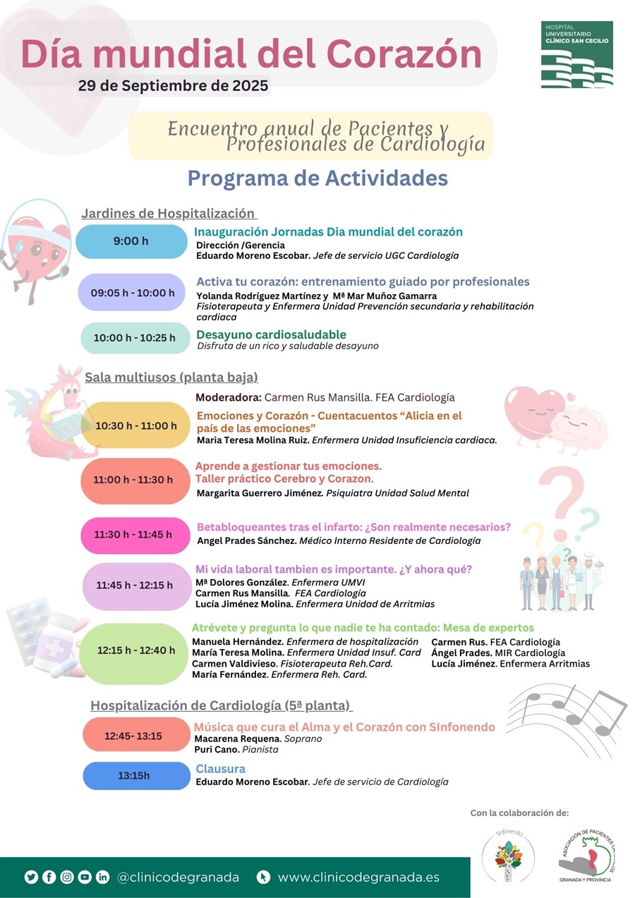 El Hospital Universitario Clínico San Cecilio de Granada y la Asociación de Pacientes Cardíacos de Granada y Provincia (ASPACGRAP) organizan el próximo lunes el encuentro anual de pacientes y profesionales con motivo del Día Mundial del Corazón.