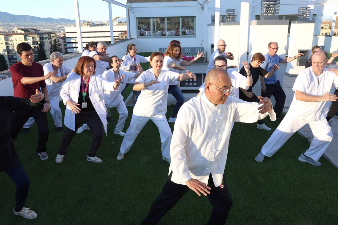 El Hospital Universitario Virgen de las Nieves de Granada organiza sesiones de taichí dirigidas a los profesionales para promocionar actuaciones saludables entre los trabajadores del centro con el reconocido experto en este arte marcial, el maestro Chen, el cual comparte sus conocimientos con unos 50 sanitarios que llevan a cabo estos ejercicios que aportan bienestar mental y físico.
