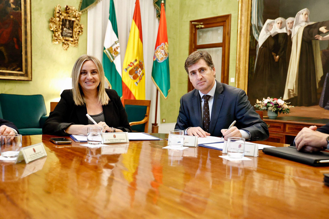 La alcaldesa de Granada, Marifrán Carazo, y Héctor Cansino, el director Territorial de Empresas y Administraciones Públicas de Orange en Andalucía (Grupo MasOrange), en Andalucía, Héctor Cansino, han formalizado la firma del convenio por el cual el operador de telecomunicaciones se convierte en nuevo colaborador del “Centro Demostrador de Inteligencia Artificial Urbano iQuantum”.