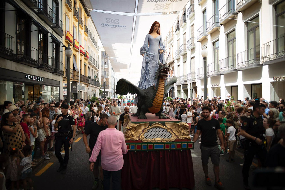 La Tarasca, montada en su dragón y escoltada por gigantes y cabezudos, anuncia así la llegada de los días grandes de la fiesta del Corpus, en uno de los momentos más entrañables y profundamente granadinos del año.
