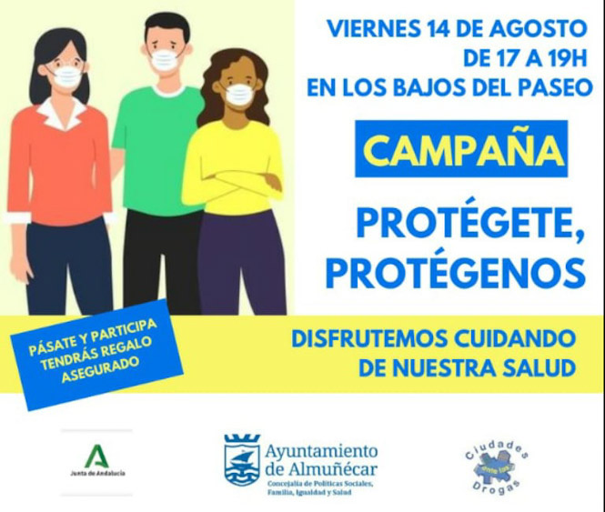 Bajo el lema “Protégete, protégenos” el Ayuntamiento de Almuñécar, a través de las áreas de Servicios Sociales, Salud y Juventud llevan a cabo este viernes, día 14, de 17 a 19 horas, una campaña de prevención en la zona de los Bajos del Paseo del Altillo y Fenicio, contando para ello con el Instituto Andaluz de la Juventud (I.A.J.)