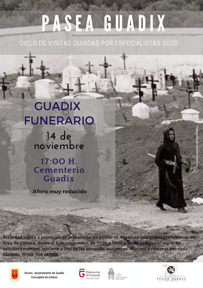 La concejalía de Cultura del Ayuntamiento de Guadix, representada por Encarni Pérez, continúa con el programa Pasea Guadix este próximo sábado 14 de noviembre, con una propuesta que tuvo que ser aplazada la semana pasada. Se trata de un ruta dedicada al Guadix funerario que se realizará en el Cementerio Municipal "San José" a partir de las 17:00 horas. Estos recorridos no serían posibles sin la colaboración del Centro de Estudios Pedro Suárez y la Delegación de Cultura y Memoria Histórica y Democrática de la Diputación de Granada.