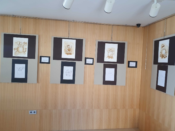 El autor muestra sus trabajos realizados a lápiz y rotulador y terminados en acuarela o en la técnica de café