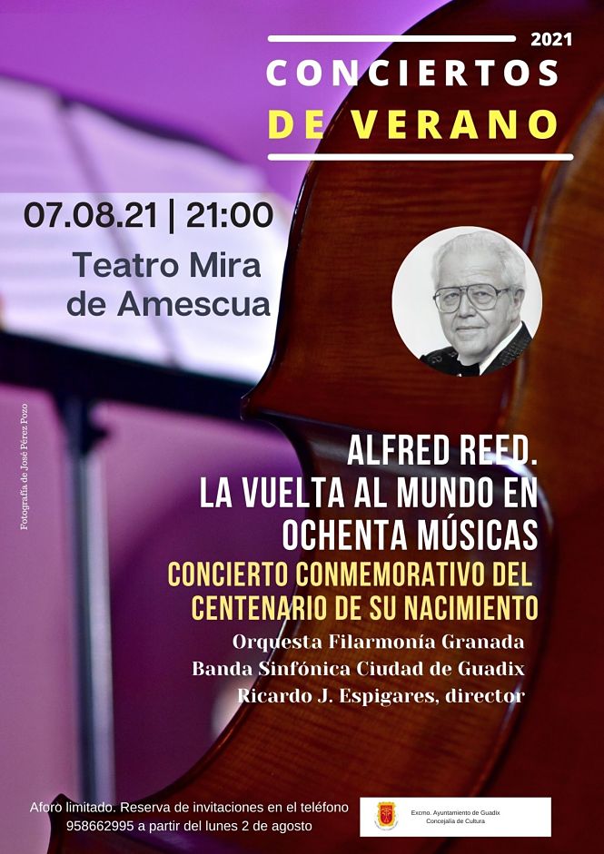 Sin duda alguna, 1921 fue el año de engendrar genios maravillosos. Alfred Reed, el aliado indiscutible de la Banda Sinfónica Municipal de Guadix, cumpliría este año cien años, cien años de hacernos volar con sus partituras, transportándonos a otros lugares a través de la música. Es por ello que el próximo sábado 7 de agosto a las 21:00 horas en el Teatro Mira de Amescua se rendirá homenaje a este magnífico compositor con un concierto conmemorativo del centenario de su nacimiento denominado "La vuelta al mundo en ochenta músicas" donde actuarán la Banda Sinfónica Municipal de Guadix y la Orquesta Filarmonía Granada bajo la dirección del maestro Ricardo J. Espigares. Este evento está enmarcado en el ciclo de conciertos de verano de la Banda Sinfónica Municipal de Guadix organizado por la concejalía de Cultura del Ayuntamiento accitano, representada por Encarni Pérez.