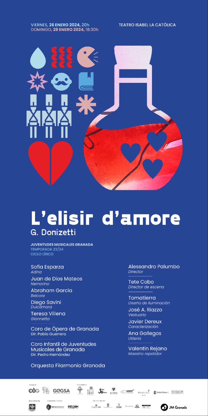 El próximo viernes, 26 de enero, y domingo, 28 de enero, en el Teatro Isabel La Católica, se podrá disfrutar de nuevo de todo un acontecimiento cultural como es una producción operística, con artistas de primer nivel, directores de prestigio internacional y nuestro Coro de Ópera de Granada y Coro Infantil de JM Granada. El título a representar: L'elisir d'amore de Gaetano Donizetti, una de las óperas más afamadas de todos los tiempos, brillante ejemplo del bel canto y del Romanticismo musical.