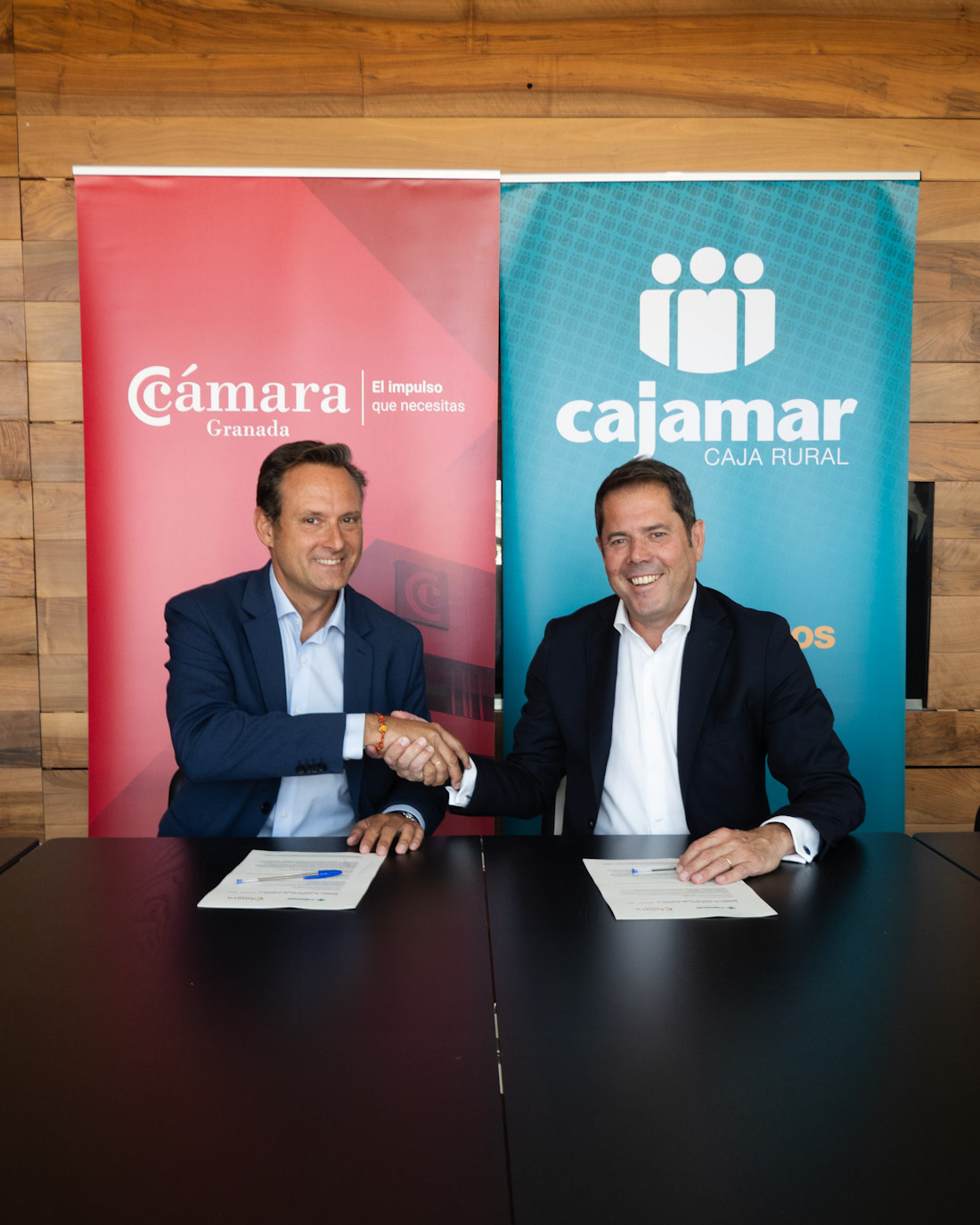 El presidente de la Cámara de Comercio de Granada, Gerardo Cuerva, y el director territorial de Cajamar, Sergio Durán, han suscrito un acuerdo por el cual las empresas pertenecientes al Club Cámara Granada podrán benefciiarse de condiciones preferentes en todos los productos y líneas de financiación destinados a facilian el día a día de sus negocios, actividades e inversiones.