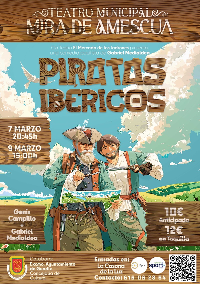“Piratas Ibéricos” es la última comedia teatral del dramaturgo accitano Gabriel Gómez Medialdea, una obra sobre piratas que nos llevará a revivir momentos de aventuras intrépidas con humor y un mensaje pacifista de candente actualidad. Una comedia loca con Genís Campillo y el propio Gabriel Medialdea, que componen un dúo de piratas antagónicos, vieja escuela y nueva. Risas para toda la familia, ya que se recomienda desde los 12 años.