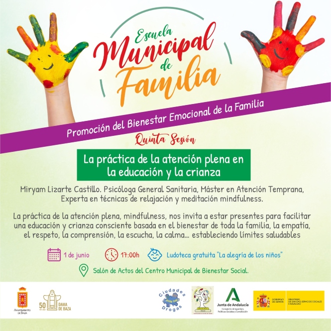 La Escuela Municipal de Familia que organiza el Ayuntamiento de Baza a través del área de Bienestar Social, Igualdad, Mujer, Salud, Deporte y Juventud continúa su programación de primavera el próximo miércoles 1 de junio con una sesión titulada “La práctica de la atención plena en la educación y la crianza”. La impartirá Miryam Lizarte Castillo, psicóloga general sanitaria, máster en atención temprana y experta en técnicas de relajación y meditación mindfulness. En esta ocasión la sesión dará comienzo a las cinco de la tarde en el salón de actos del Centro Municipal de Bienestar Social y, para facilitar la asistencia, se contará con servicio de ludoteca gratuita de la mano de “La alegría de los niños”.
