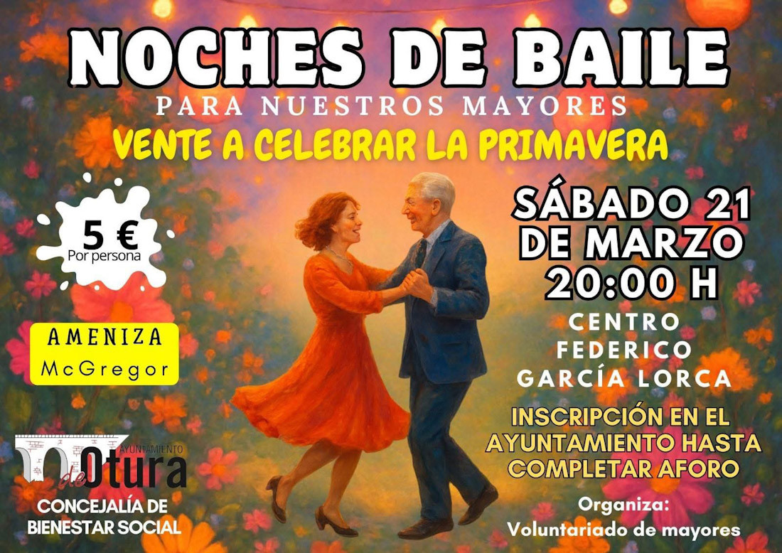 El Ayuntamiento de Otura, a través de la Concejalía de Bienestar Social y el grupo de Voluntariado de mayores, ha organizado una edición especial de las ‘Noches de baile para nuestros mayores’ con motivo de la llegada de la primavera. Bajo el lema “Vente a celebrar la primavera”, la iniciativa busca fomentar el envejecimiento activo y combatir la soledad mediante la convivencia y la música.