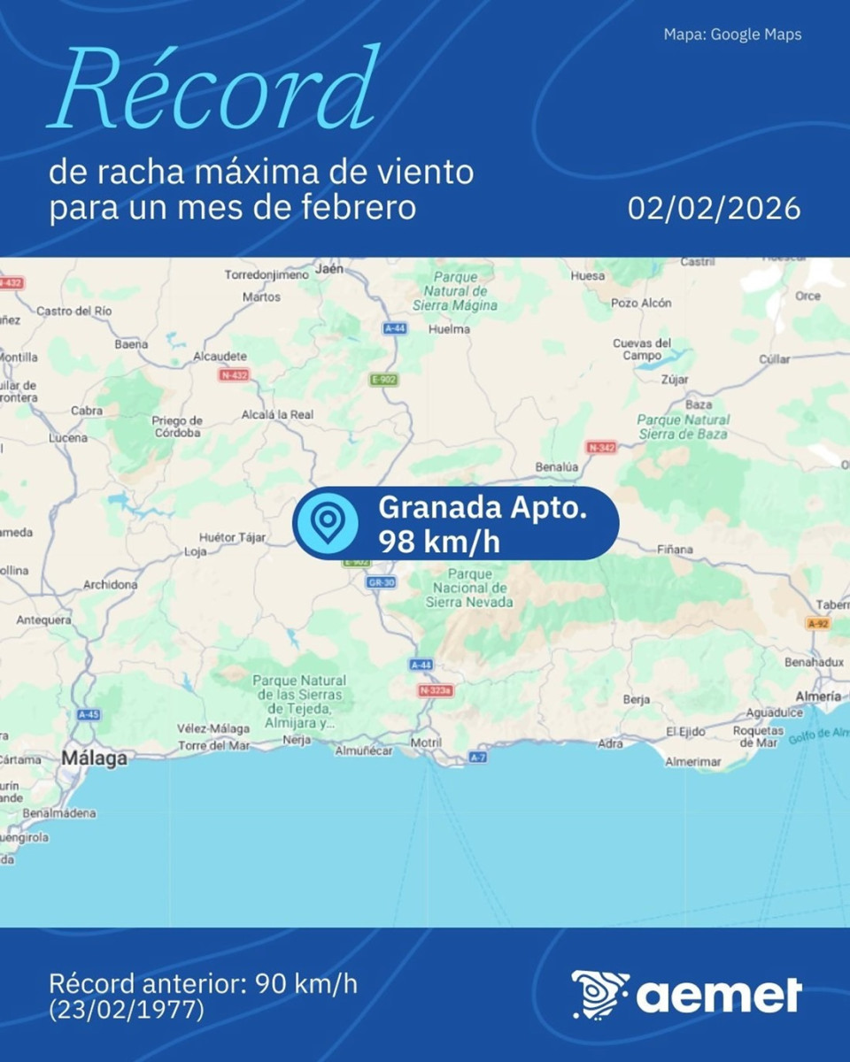 El aeropuerto de Granada, situado en el término municipal de Chauchina, batió este pasado lunes su récord de racha máxima de viento para un mes de febrero, con 98 kilómetros por hora. El anterior registro máximo era de 90 kilómetros por hora y se produjo en 1977, según ha informado la Agencia Estatal de Meteorología (Aemet) a través de sus redes sociales.