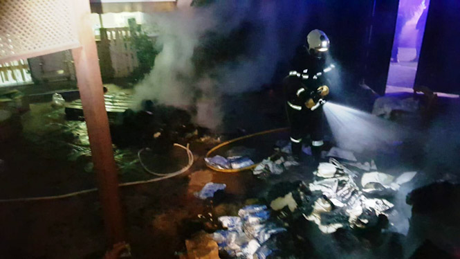 Procedieron a la extinción del incendio actuando directamente sobre las llamas y removiendo el material. “Se trataba de varios palets de papeles, archivadores y otros de material textil, como ropa de cama y toallas. También encontramos restos de material inflamable en una mesa, algún tipo de pastillas para encender barbacoas. Era necesario remover los rescoldos para apagarlos completamente, alejándolos de la zona ajardinada y de una pila de madera, incluidos los propios palets quemados parcialmente. También conseguimos disipar todo el humo y reducir su impacto tóxico procedente tanto del plástico usado para embalaje como la propia materia textil.”, explicaron los Bomberos, quienes tras controlar y sofocar el incendio, tarea que se prolongó durante una hora, aproximadamente, proporcionaron acceso a los agentes para que revisaran el resto de la vivienda.