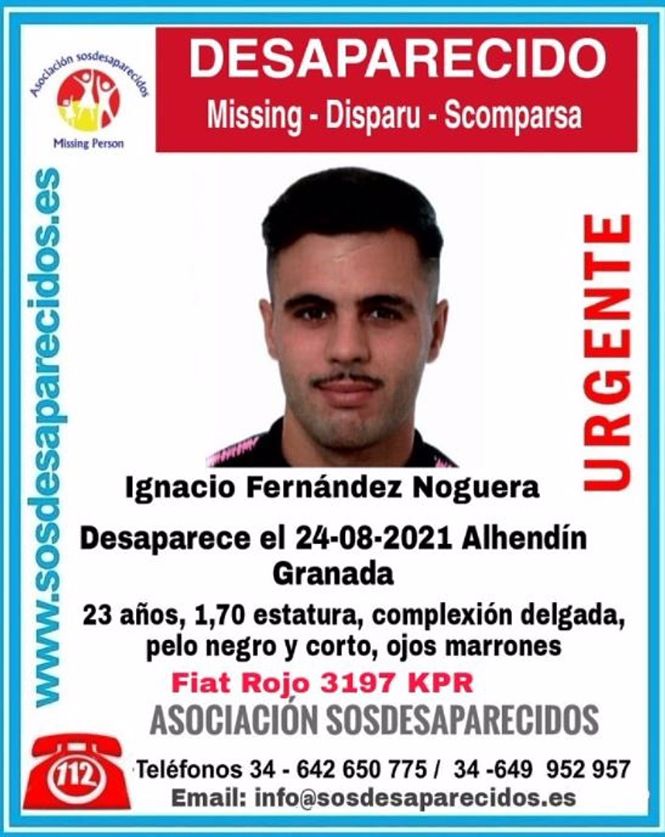 Continúan las labores de búsqueda de Ignacio Fernández Noguera, un joven de 23 años de Alhendín (Granada) que continúa en paradero desconocido desde el pasado 24 de agosto, según denunciaron a las autoridades sus familiares. Aunque la familia no pierde la esperanza de localizarlo, asegura que a su hijo "le ha pasado algo".