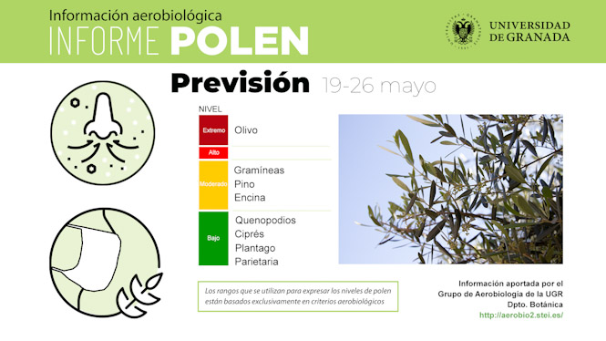 Este informe, que la UGR publica en su web y redes sociales, recoge una previsión semanal del impacto de los diferentes tipos polínicos que se encuentran en el aire de la capital granadina. Además, amplía la evolución histórica y presente de los dos tipos que presentan mayores cotas durante estos días: olivo, en nivel alto; y gramíneas, en nivel moderado ascendente.